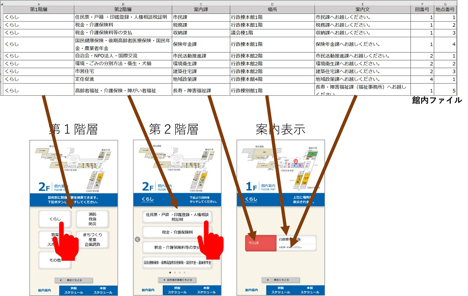 館内案内(目的別・課名)の表示内容をExcelファイルで管理