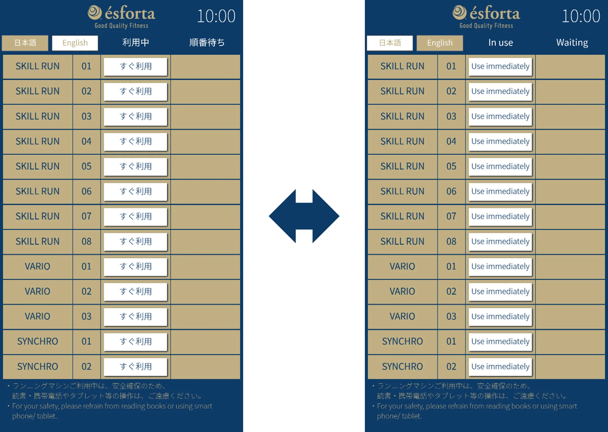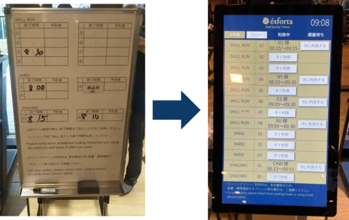 元々はホワイトボードを使って利用者の管理をしていましたが、高級感のある店舗に合わせてタッチサイネージへ変更されました。ブランドカラーを使った画面デザインで店舗の雰囲気を崩すことなく導入することができました。