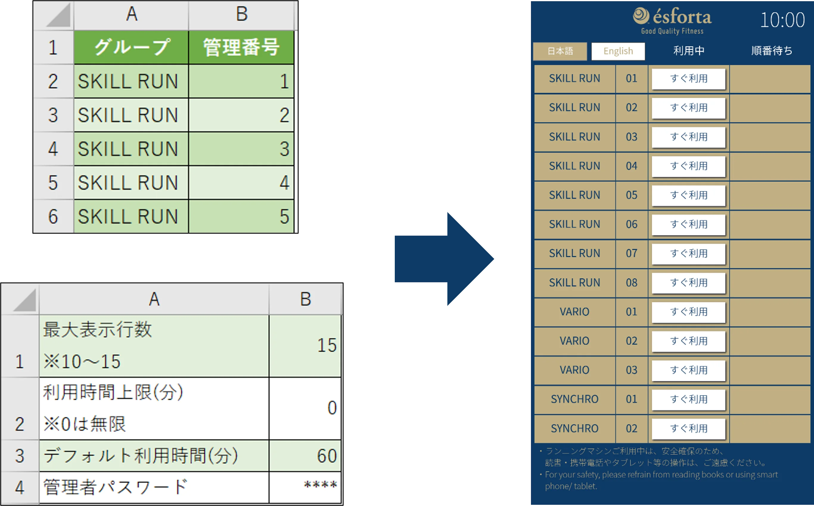 表示するマシンの名前や行数、デフォルトの利用時間などは全てエクセルファイルで管理しているため、店舗に合わせて簡単に設定を変更することができます。