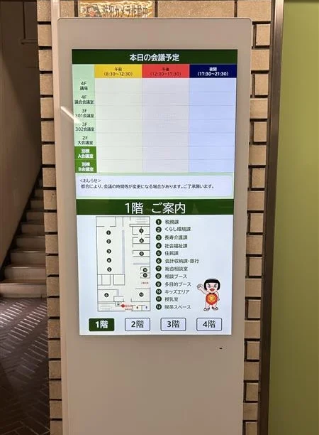 庁舎改修にあわせてサイネージを導入し、場所に応じて