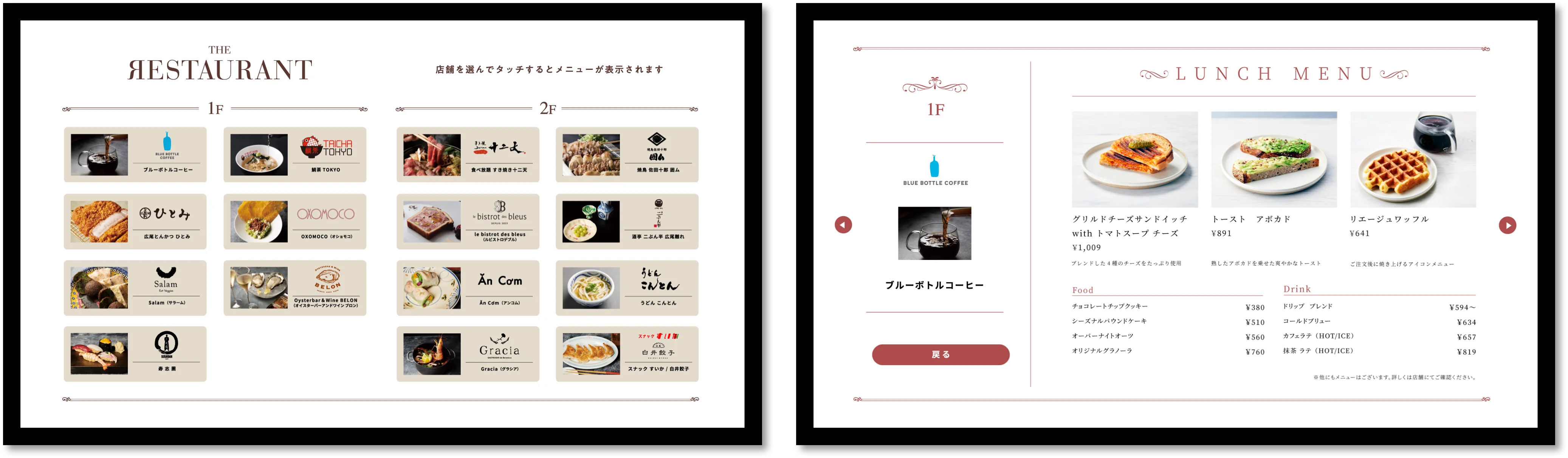 来店者は画面をタッチするだけで、各店舗の詳細情報やメニューを簡単に確認 できます。