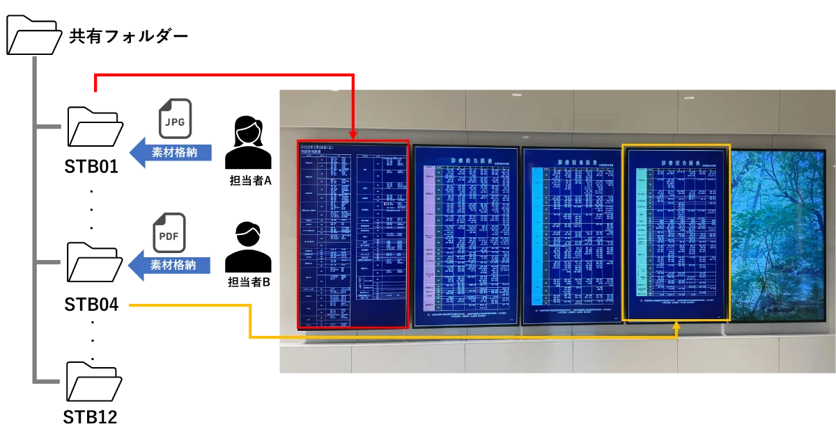 院内の共有フォルダ―にSTB毎にフォルダーを作成し、素材を格納するだけで掲示の更新が可能。