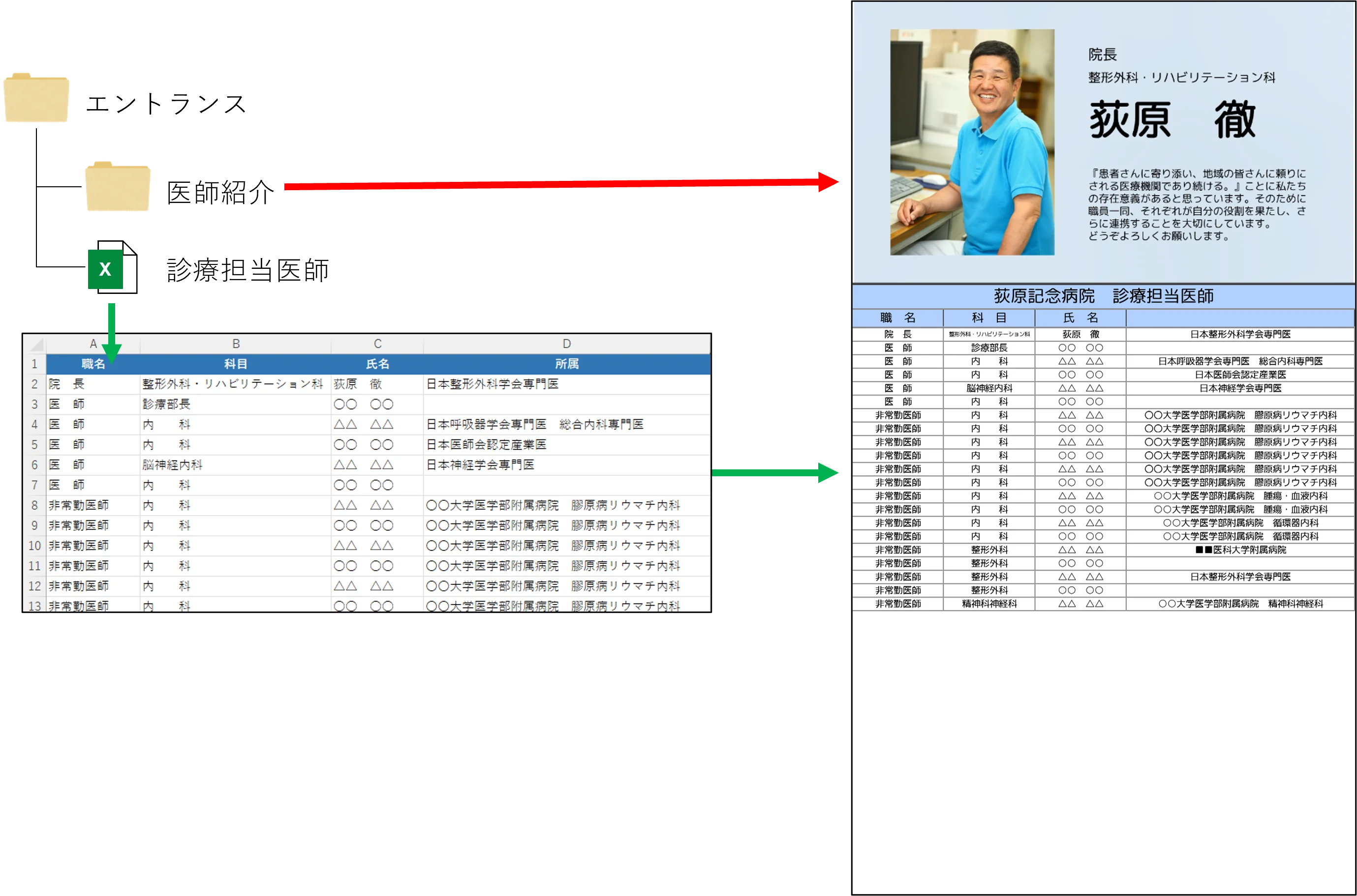 医師紹介の画像・動画と、診療担当医師の一覧を組み合わせて表示しています。それぞれファイルの入れ替えやエクセルファイルの書き換えだけでコンテンツを更新することができます。