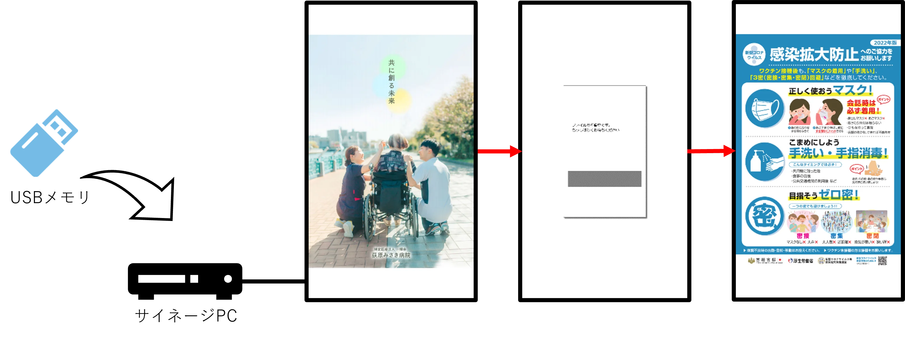 院内ネットワークへの接続が難しいため、USBメモリでコンテンツ更新ができるようにしています。稼働中のサイネージPCにUSBメモリを差し込むと、自動的にファイルをコピーして表示します。