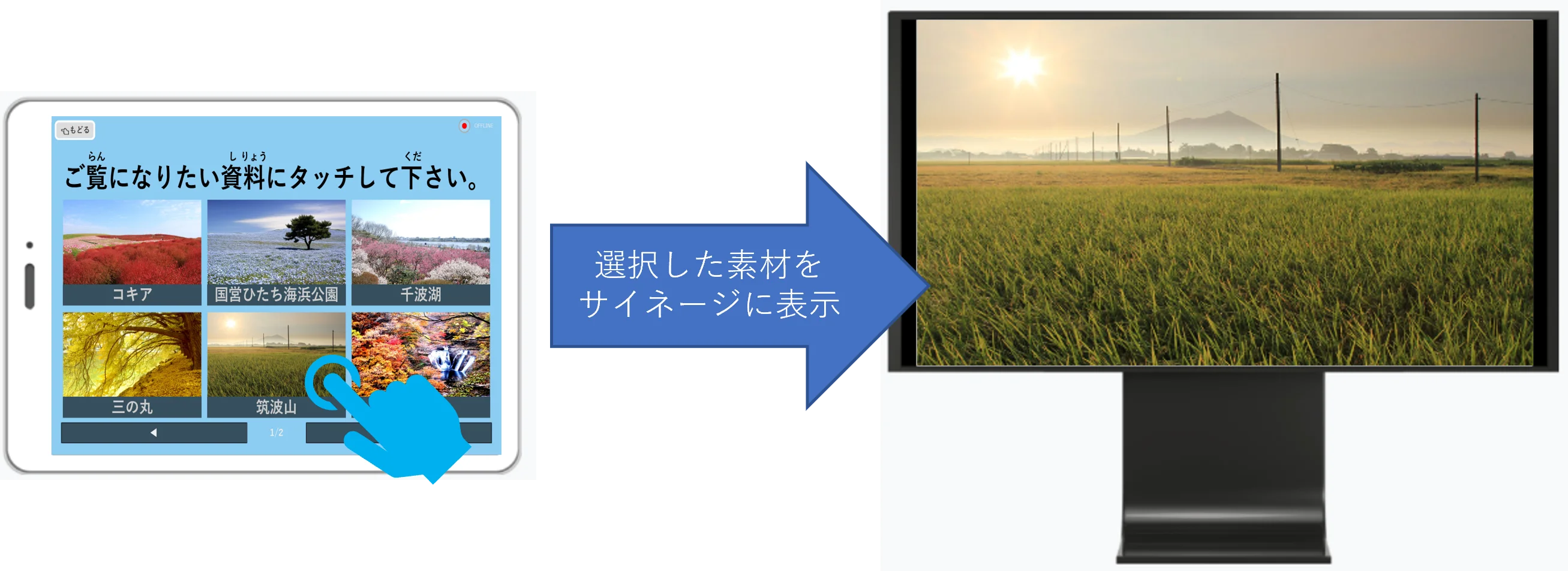 タブレット連携で選択した素材を大型のデジタルサイネージに表示