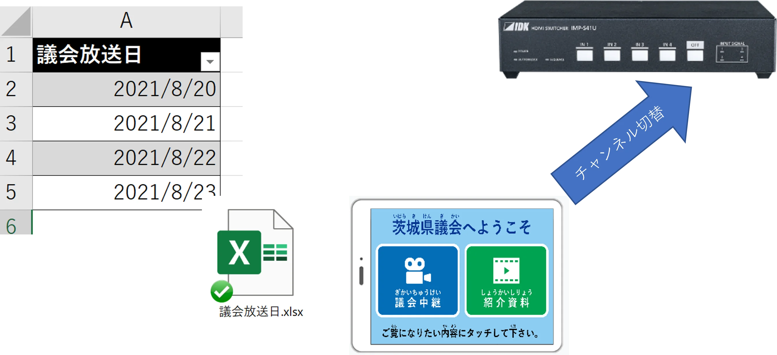 タブレット内に保存した議会放送日.xlsxに議会放送予定日を設定することで、タブレット内のアプリ起動時にスイッチャーを議会放送のチャンネルに切り替えるようにしました。