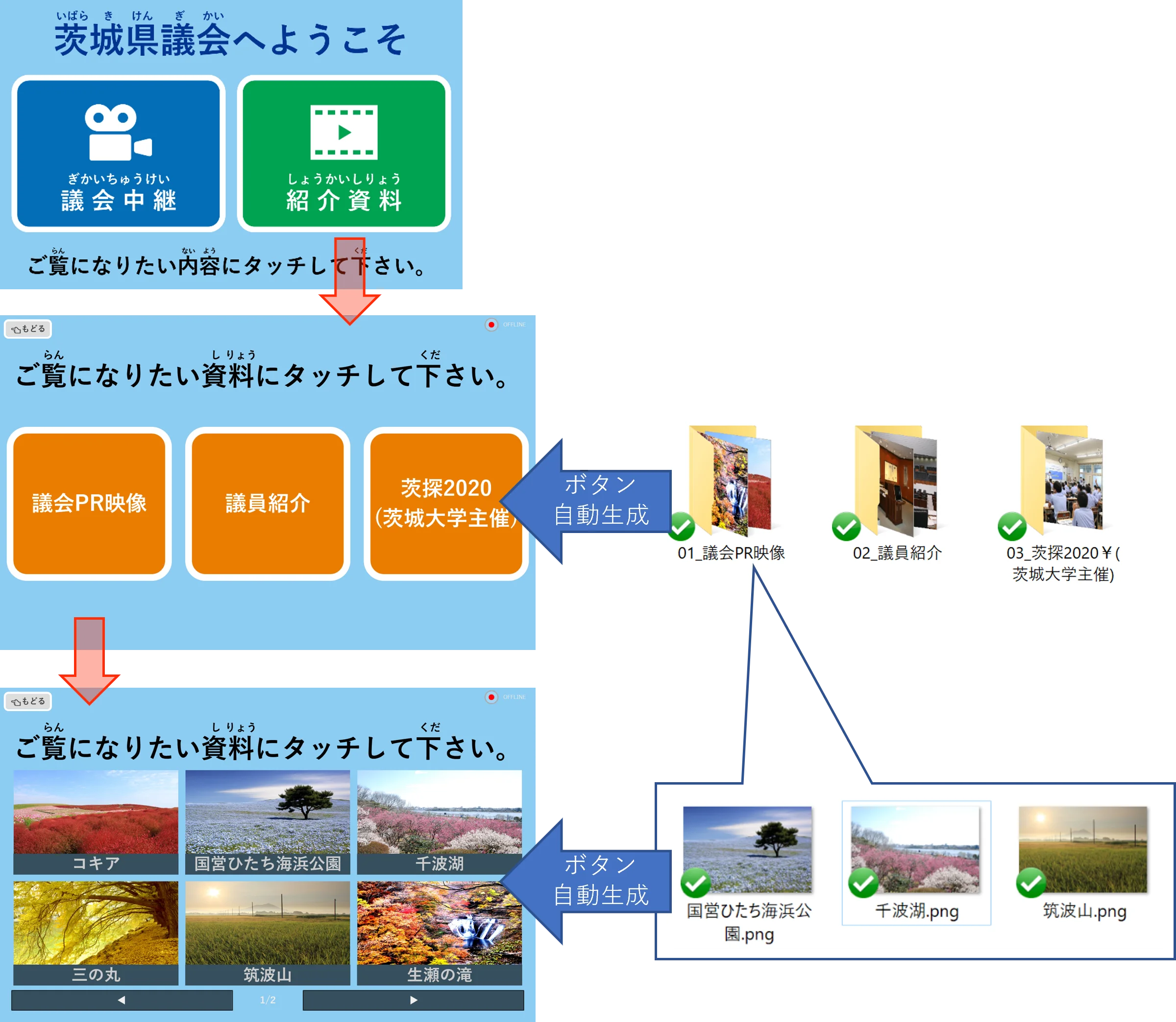 フォルダーボタンの機能を利用すると、所定のフォルダーに動画・画像、PDFを入れるだけで、ボタンが自動的に生成されます。今まで難しかったデジタルサイネージの更新も簡単に行うことができ、新鮮な情報を表示することが可能です。