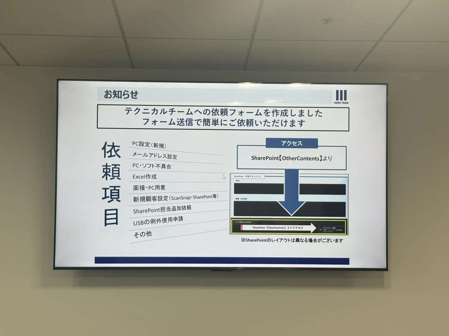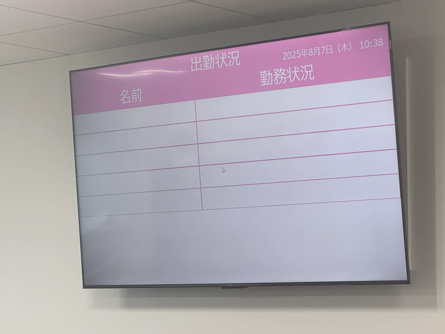 社内で共有すべき情報が増える中、メールや口頭連絡では伝達にムラがあるとの課題がありました。「一目で勤務状況や業務イベントが把握できる仕組みを作りたい」との要望から、サイネージ導入を検討され、柔軟な表示が可能なKI Signが採用されました。