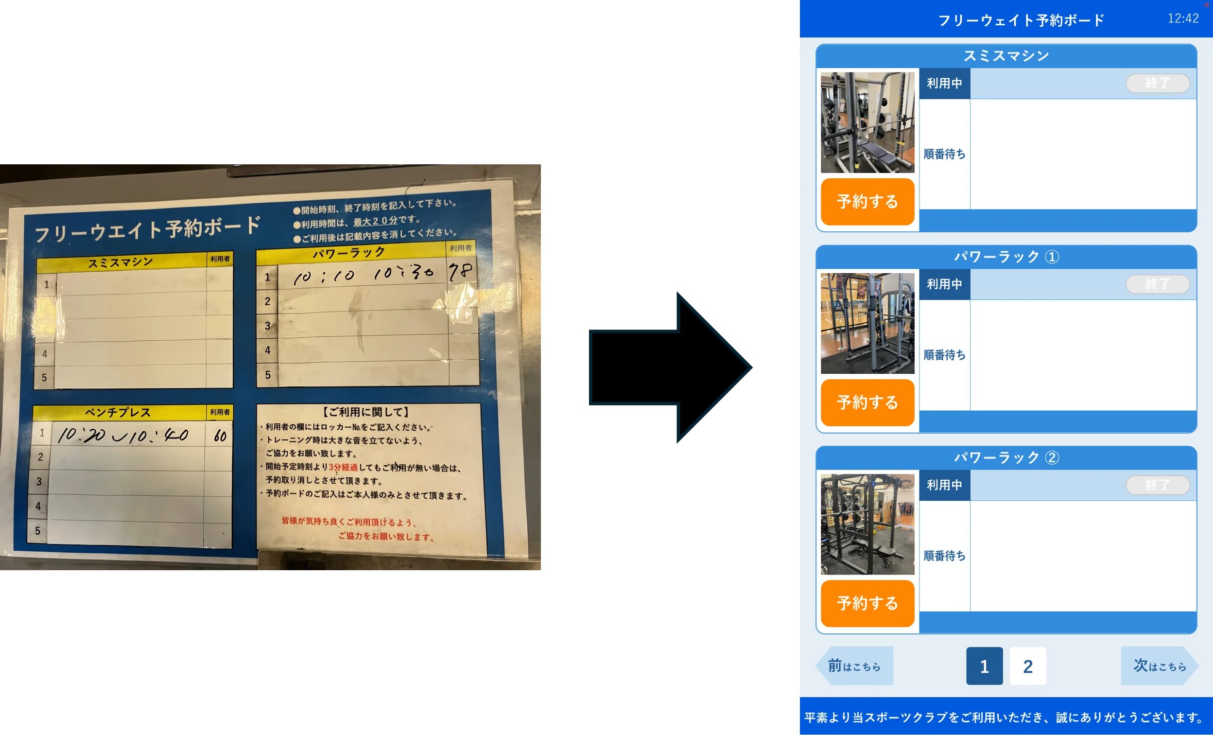 従来のホワイトボードを使った予約管理を、KI Signを活用したデジタルシステムに刷新しました。このデジタル化により、手書きの煩雑さを解消し、予約の管理や情報更新がスムーズに行えるようになりました。利用者にとっても直感的な操作で予約が可能となり、施設全体のサービス向上に繋がっています。