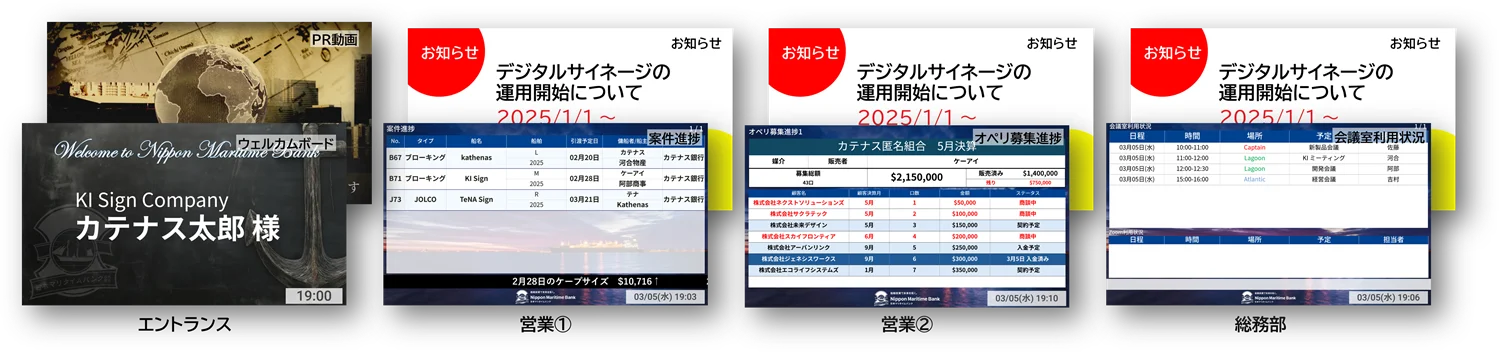 社内情報の共有を強化するためにエントランス・営業部・総務部にデジタルサイネージを導入しました。それぞれの部門で異なる情報を表示することで、業務効率の向上を目指しました。