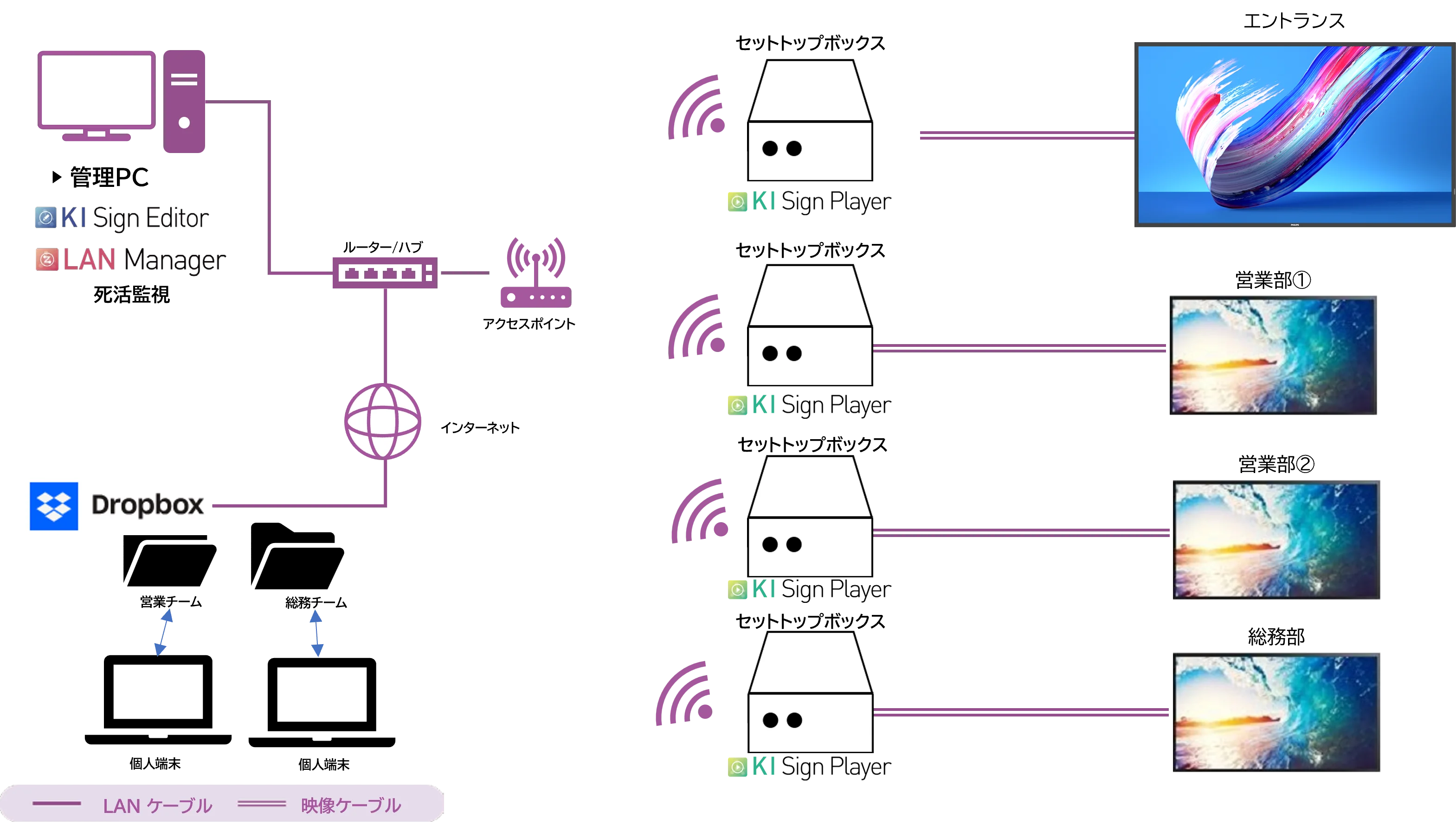 KI Sign Playerの参照フォルダの一部をDropboxと連携し、PDFや画像を追加するだけでサイネージが自動更新される仕組みを導入。更新時に専用アプリは不要で、誰でも簡単に運用可能。リアルタイムの情報共有をスムーズに実現しました。