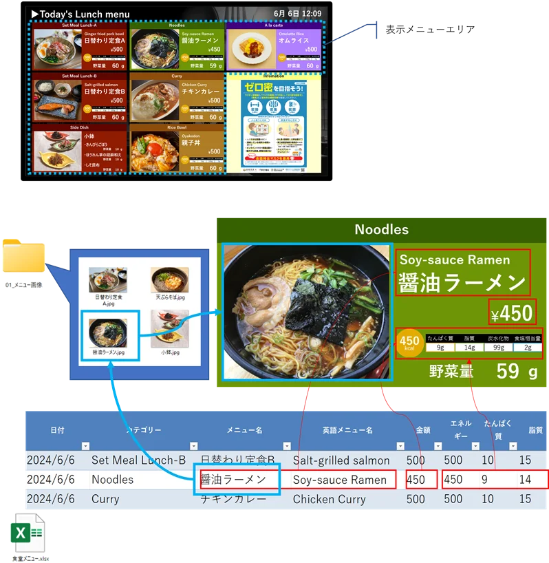 表示メニューの文字情報と料理写真はExcelファイルで管理