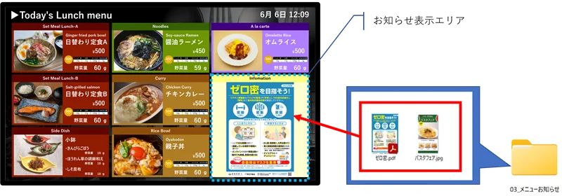 お知らせ表示エリアでは「メニューお知らせ」フォルダーに格納した画像をスライドショー再生します。