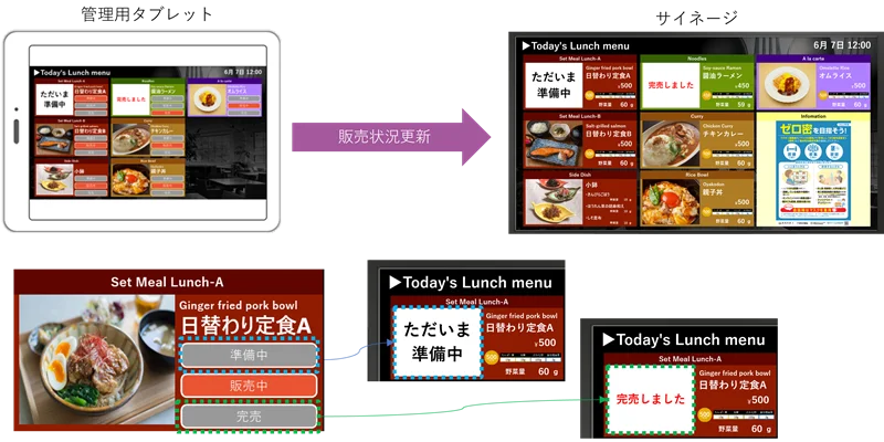 厨房内にある管理用タブレットから各メニューの販売状況表示を更新することができます。タブレット上の各メニューに配置されている準備中ボタン、完売ボタンをクリックすると、サイネージの販売状況表示が切り替わります。