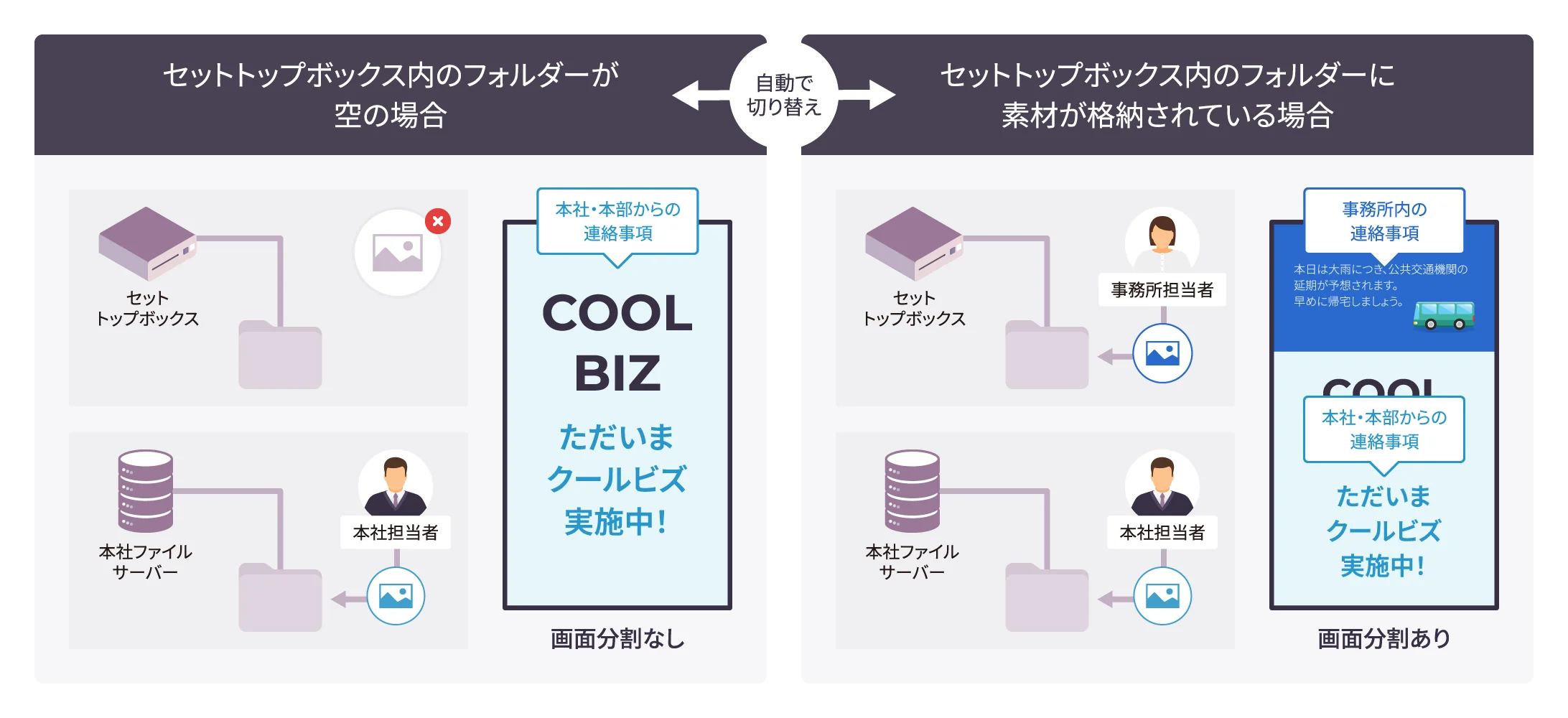 一括配信し、各事業所ではローカルな業務情報を独自に発信できるフォルダー管理にも対応。