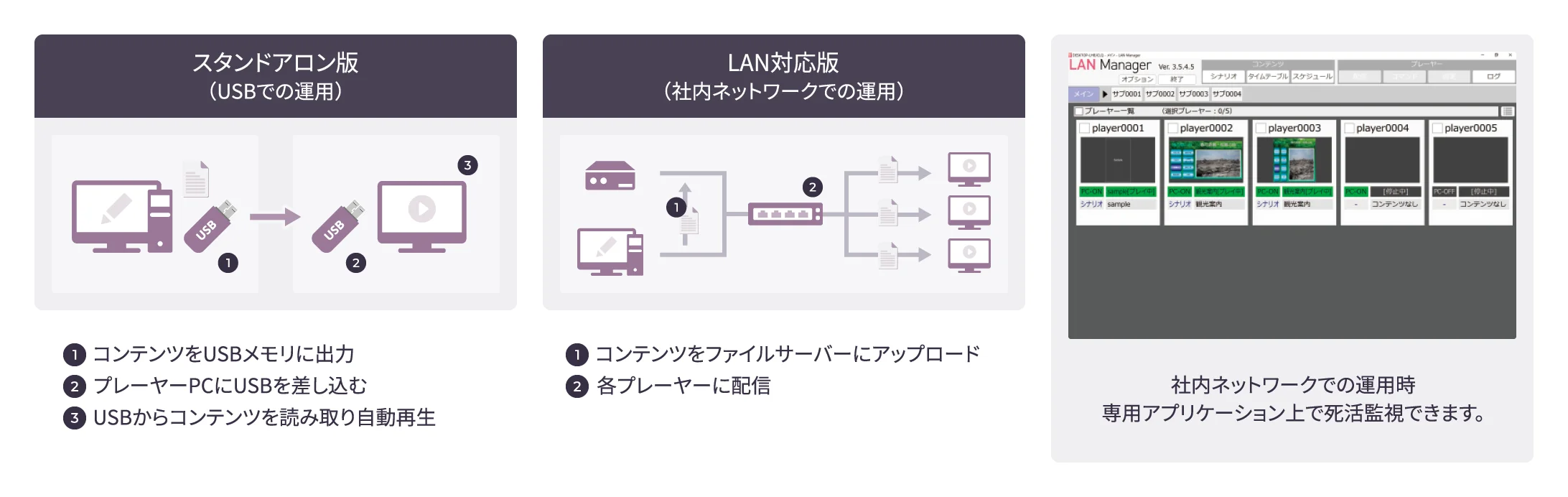 USBでの運用や社内ネットワークを活用した運用など、ご要望に合わせた柔軟な運用が可能です。