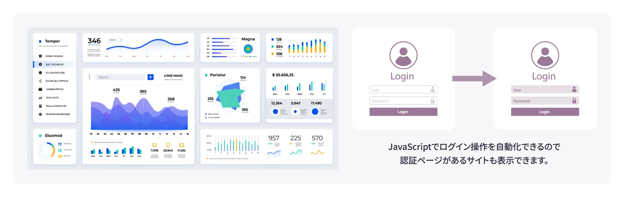 これによりポータルサイトやダッシュボード等を直接サイネージに表示させることができるため、コンテンツの更新の手間を軽減できます。 -