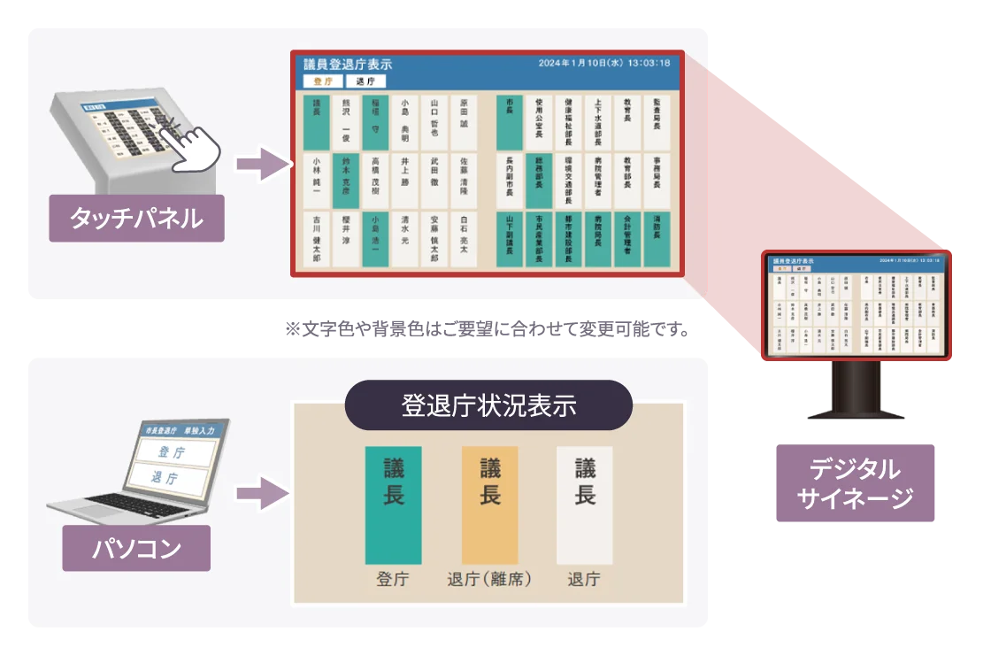 登退庁状況を設定可能操作用タッチパネルを配置した場所毎に異なる登退庁状況を設定することが可能です。 例えば、正面玄関でタッチ操作した場合、緑色に表示し、その後議場入り口でタッチ操作した場合、 赤色に表示するなど、登退状況の他に所在を色で示すといったことができます。